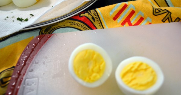 - Allow the peeled eggs to cool. Once completely cool, slice each egg in half across the mid-section. Slice a tiny piece from the bottom of each half to stabilize the base for serving.